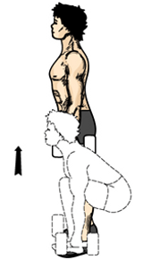 Provedení: Uchopte do obou rukou jednoručky kladivovým úchopem (palce rukou k tělu a hřbety od těla), ruce s činkami nechte volně viset podél těla. Vypněte hrudník a zatáhněte ramena dozadu.