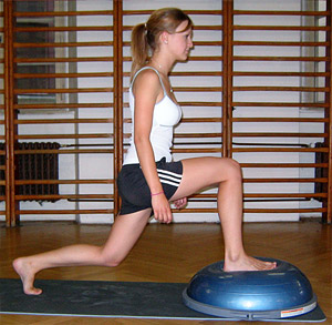 Postavte se vzpřímeně, zatáhněte ramena dozadu, vypněte hrudník a takto vydržte po celou dobu cviku. Jednou nohou udělejte dlouhý krok dopředu a chodidlo této nohy umístěte na podložku vysokou zhruba 30 cm.
